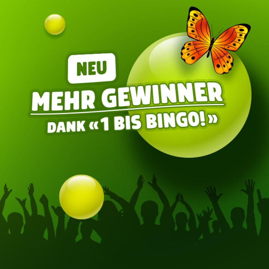 Dank dem neuen Gewinnrang «1 bis Bingo» haben Sie eine zusätzliche Chance auf einen Gewinn. Wenn das komplette Gewinnmuster erzielt wird, dann erhalten nämlich alle Spielerinnen und Spieler ebenfalls einen Gewinn, denen eine Zahlt fehlt, um das Muster zu komplettieren.