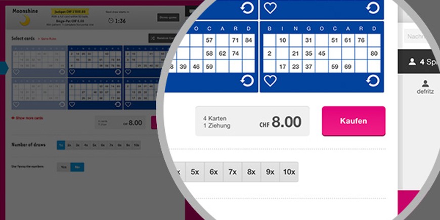 Klicken Sie ganz einfach auf die entsprechende Bingo-Karte und danach auf „Kaufen“. Mit dem Klick auf „Kaufen“ bestätigen Sie alle von Ihnen getätigten Angaben. Die von Ihnen ausgewählten Bingo-Karten werden somit für die nächste Bingo-Ziehung gekauft.