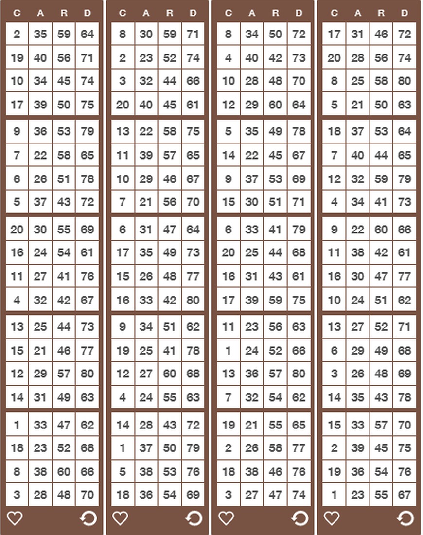 Beim 80-Zahlen-Bingo wird eine 4x4 Reihen Bingo-Karte verwendet. Jede Bingo-Karte hat somit 16 unterschiedliche Zahlen.