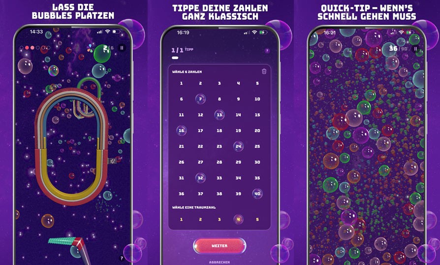 Die EuroDreams-App bietet dir drei Möglichkeiten, deine Tipps zu erstellen. Du kannst spielerisch Bubbles platzen lassen, klassisch deine Zahlen selber auswählen oder – wenn’s schnell gehen soll – dich für einen Quick-Tip entscheiden.