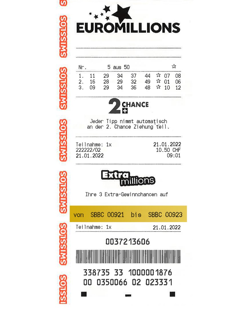 Bei der Ziehung vom 22. November 2024 werden aus allen Teilnahmecodes 100 Gewinner oder Gewinnerinnen gezogen. Die Glückspilze, welche einen der 100 Gewinncodes auf Ihrer Spielquittung finden, werden um 1 Million* reicher. Die gezogenen Gewinncodes werden bei den EuroMillions Gewinnzahlen auf der Internetseite von Swisslos veröffentlicht.