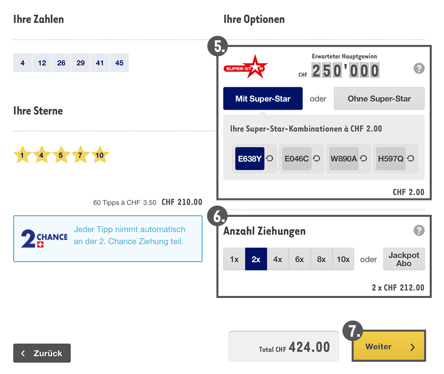 - Wählen Sie, ob Sie EuroMillions mit oder ohne Super-Star spielen wollen. Sie können bis zu vier Super-Star-Kombinationen spielen. Jede Super-Star-Kombination kostet CHF 2.00.