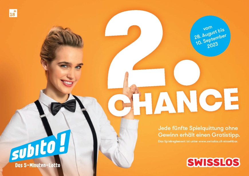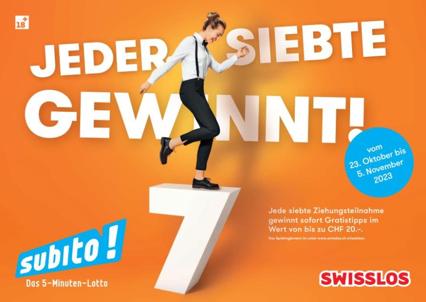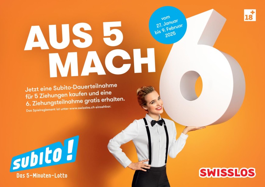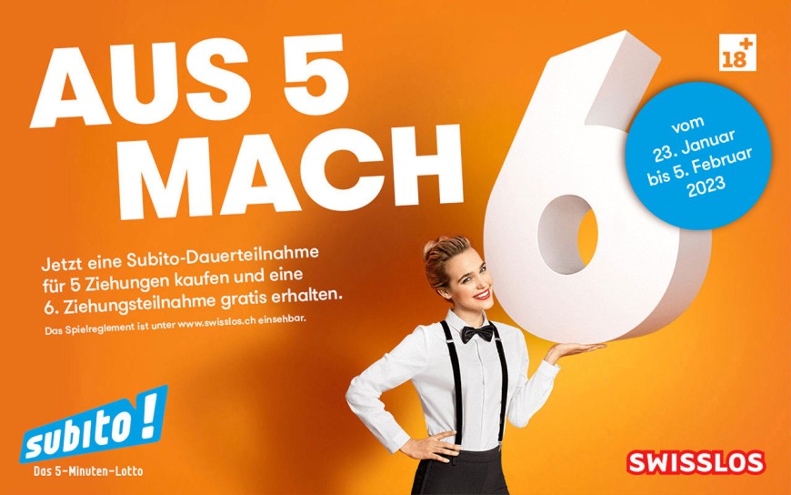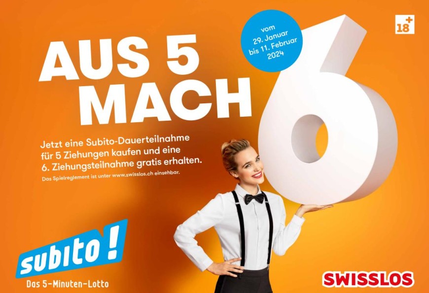 Vom Montag 23. Januar bis am Sonntag 05. Februar profitieren Sie von einer attraktiven Promotion bei Subito: Beim Kauf einer Subito Dauerteilnahme für 5 Ziehungen erhalten Sie eine 6. Ziehungsteilnahme geschenkt.