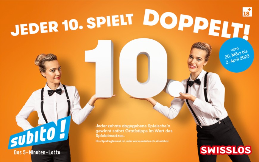 Vom Montag 27. Januar bis am Sonntag 09. Februar profitieren Sie von einer attraktiven Promotion bei Subito: Beim Kauf einer Subito Dauerteilnahme für 5 Ziehungen erhalten Sie eine 6. Ziehungsteilnahme geschenkt.