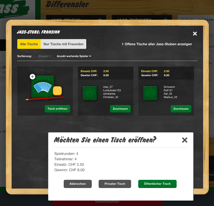 Klicken Sie in der gewählten Jass-Stube auf «Tisch eröffnen». Es erscheint ein Dialog zum Einrichten des Spiels. Sie können einen privaten (nur beim Differenzler) oder öffentlichen Tisch einrichten.