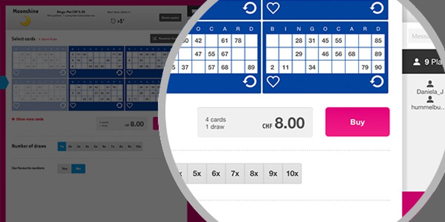 Swisslos Bingo products are available in multiplayer mode and always include a chat function. In an Internet context, the term chat means live online communication via text messages between at least two participants.
