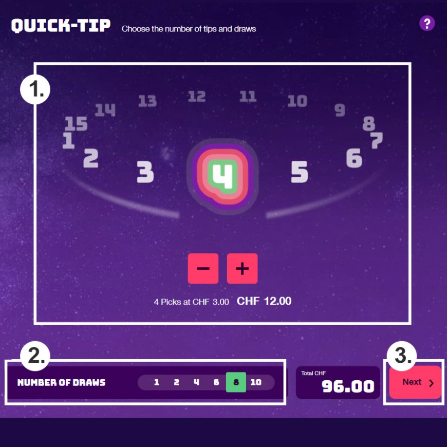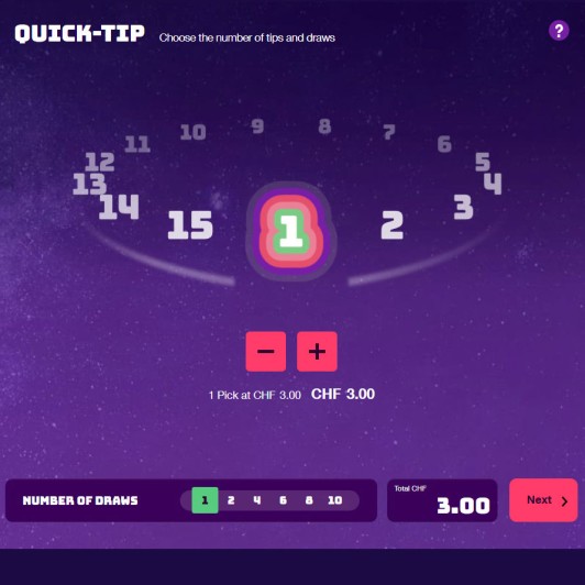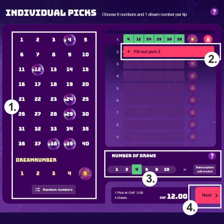 With individual picks, you choose your numbers and dream number yourself for each pick. A pick costs 3 francs. You can select between 1 and 15 picks.