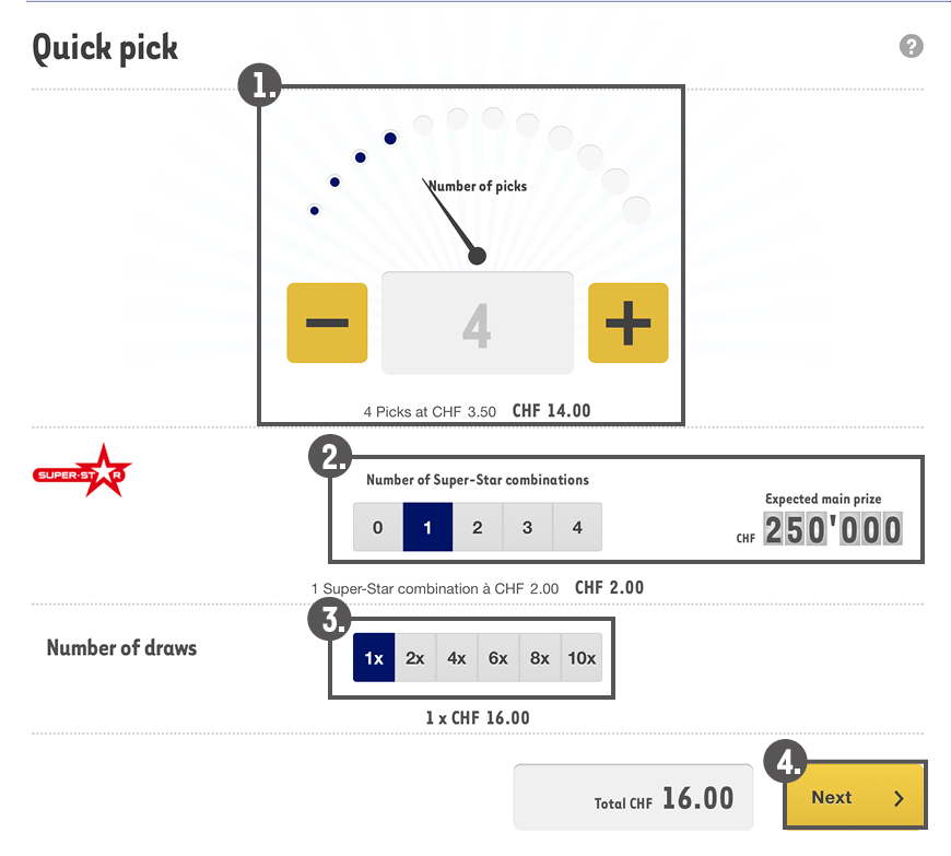 2. Choose how many Super-Star combinations you want to play. You can play up to four Super-Star combinations. Each Super-Star combination costs CHF 2.00. Zero Super-Star combinations indicates that you are playing EuroMillions without Super-Star.