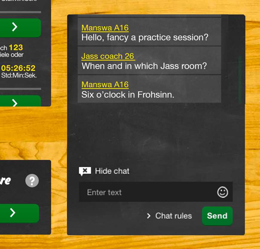 The match starts automatically as soon as all the seats are occupied. In Differenzler, the players are allocated seats at the playing table at random. In Schieber and Coiffeur, seats at the table can be chosen.