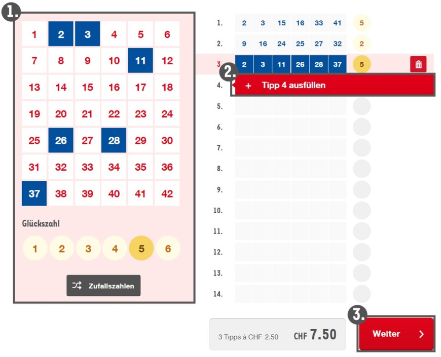 1. In the entry field, choose the numbers for your first Swiss Lotto pick. A pick always consists of 6 numbers (1-42) and 1 lucky number (1-6).