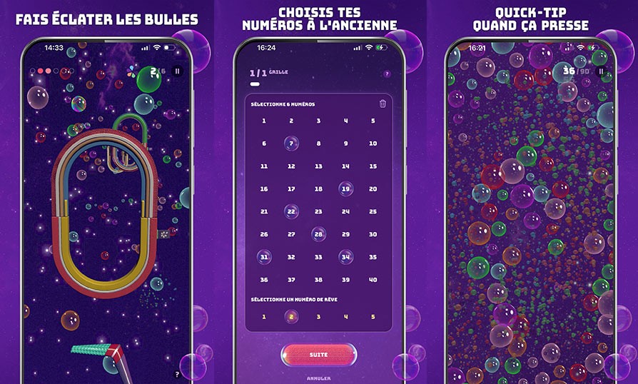 L’app EuroDreams te propose trois manières de composer tes grilles : de manière ludique en faisant éclater les bulles, classique en sélectionnant toi-même les numéros ou si le temps presse, en optant pour le Quick-Tip.