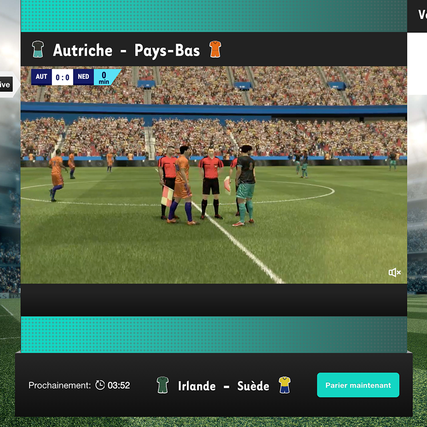 De A comme attaquant à Z comme zlataner – les matches de football virtuels de Swisslos vont combler tous les amoureux du ballon rond. Et même plus encore! À Goooal, vous ne jouez pas seulement pour la galerie mais bien pour engranger 24 heures sur 24 de beaux gains! Toutes les quatre minutes démarre un nouveau match. Vous avez la possibilité de parier sur le résultat exact, sur l’équipe qui marque le premier but et sur l’équipe qui marque le dernier but. Un clip réunit les meilleures séquences du match. Vibrez intensément, et soyez prêt à remporter votre pari.