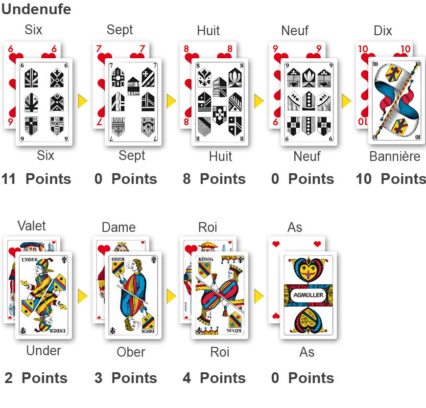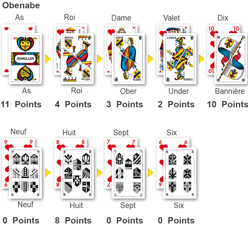 L'atout n'existe pas dans les variantes Obenabe et Undenufe. L'ordre et la valeur des cartes sont repris dans le tableau ci-contre. Dans la variante Obenabe, l'As est la carte la plus forte. En revanche, dans la variante Undenufe, le 6 est la carte la plus forte. De même, dans les variantes Obenabe et Undenufe, une carte d'un rang plus élevé prend la main sur une carte d'un rang inférieur.