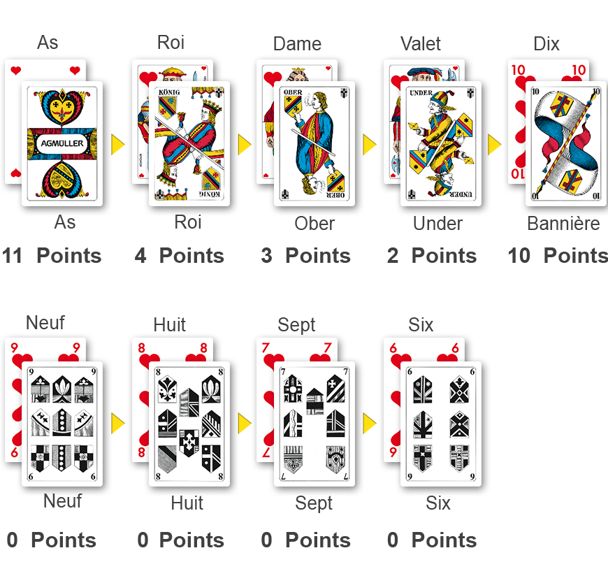 La couleur désignée « atout » prend la main sur chaque rang d'une couleur annexe. L'ordre et la valeur des cartes « atout » sont repris dans le tableau ci-contre. Une carte d'un rang plus élevé prend la main sur une carte de rang inférieur.