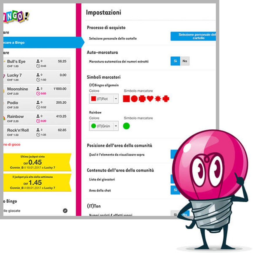 D’ora in poi il Bingo sarà unico, proprio come lei. Grazie alle nuove impostazioni, sarà lei a decidere come visualizzare il Bingo. Ad esempio può decidere dove piazzare la chat, oppure con quale colore dovranno essere coperti i numeri estratti. In questo modo avrà sempre al posto giusto le informazioni che per lei contano.