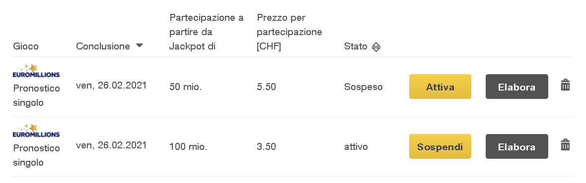 Alla voce "Pronostici singoli" o "Pronostici da sistema" è possibile definire il numero di estrazioni. Selezionare "Jackpot Abo" per partecipare automaticamente a tutte le estrazioni fino all’annullamento, ovvero quando il jackpot raggiunge l'importo prestabilito e ci sono soldi a sufficienza sull’account di gioco. Se il denaro sul conto non bastasse per giocare con l’Abo, il partecipante sarà immediatamente contattato da Swisslos per e-mail.