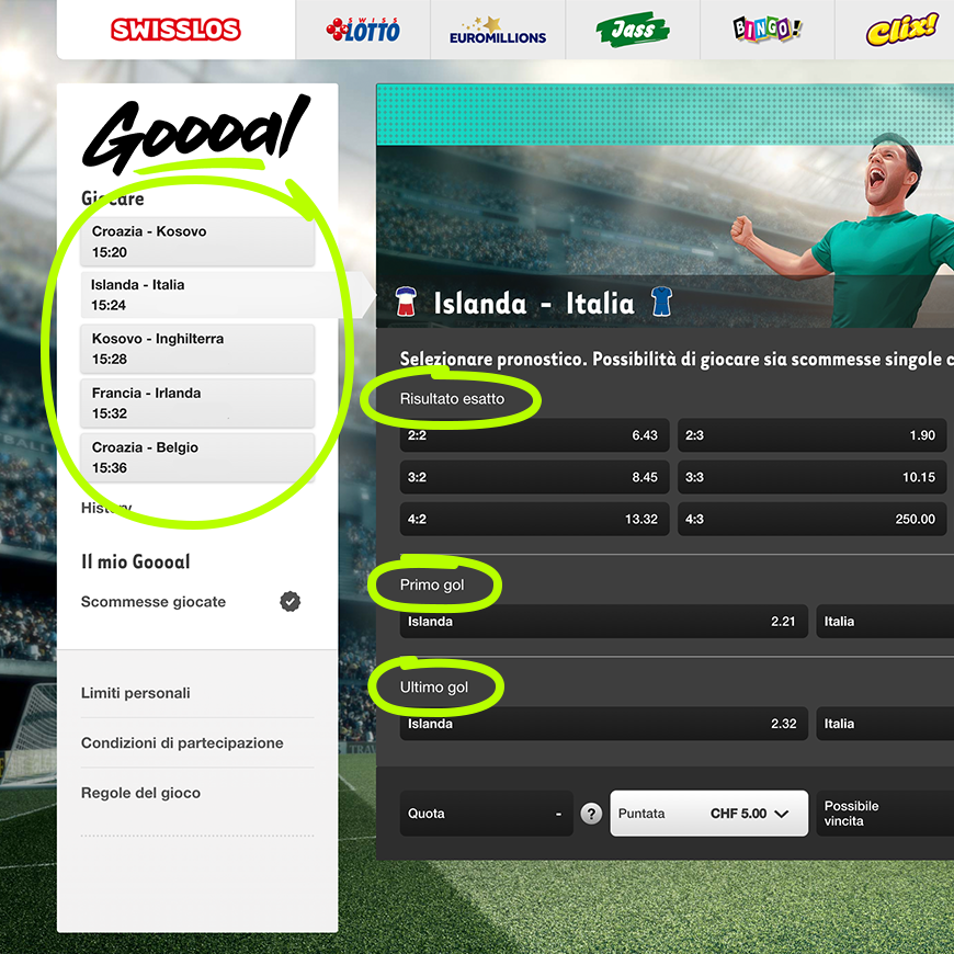 Dalla A di attaccante alla Z di zucchero, nel senso di “passaggio allo zucchero” nel gergo calcistico, ovvero il passaggio perfetto: ebbene sì, le partite di calcio virtuali di Swisslos offrono tutto quello che fa breccia nel cuore degli appassionati del pallone. E forse anche di più! A Goooal non si gioca solo per la galleria di foto, bensì anche per realizzare vincite cospicue, e questo 24 ore su 24! Ogni quattro minuti prende avvio una nuova partita: si può scommettere sul risultato esatto e su quale squadra segnerà il primo goal e quale segnerà l’ultimo. I migliori estratti della partita saranno sintetizzati nella clip degli highlight. Esulti con noi, se la sua scommessa sarà vincente.