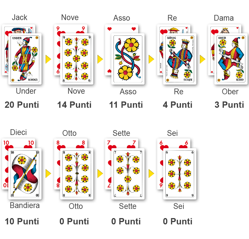 In questa pagina vengono spiegate le nozioni basilari dello jass: le carte da gioco, l’ordine di presa e il punteggio delle carte.