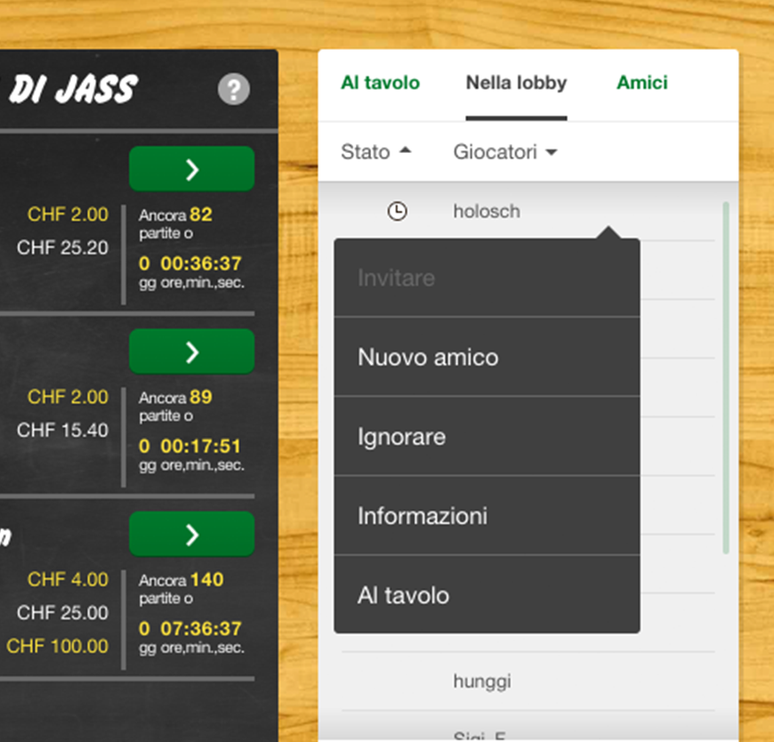 Nella lobby dello jass è reperibile un elenco sempre aggiornato di tutti i giocatori loggati.