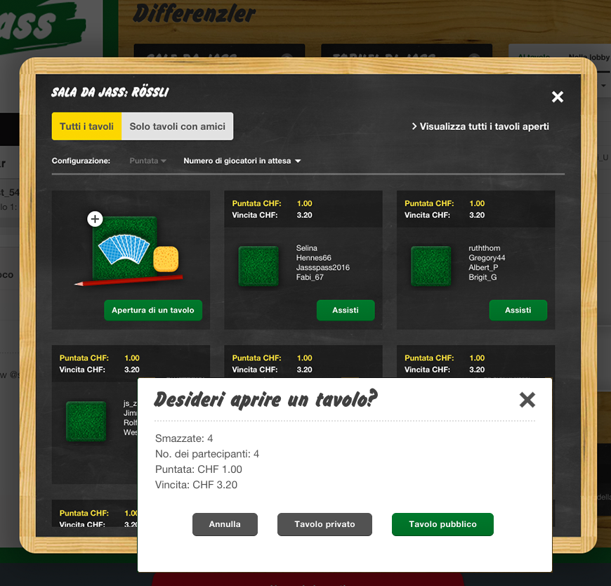 Nella sala jass prescelta cliccare su "Apertura di un tavolo". Appare una finestra di dialogo per impostare il gioco. C'è la possibilità di aprire un tavolo privato (solo per Differenzler) o un tavolo pubblico.